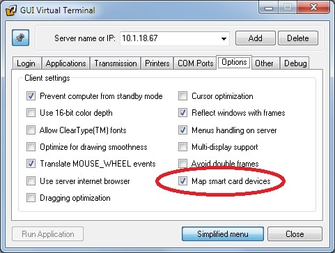 Then run Winflector client (wfc.exe) and turn on the smart card support: Advanced menu -> Options tab -> Map smart card devices (please see the attached screenshot).